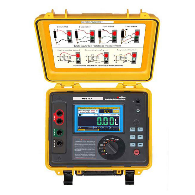 Weshine® VS-3127은 배터리로 구동됩니다.변압기의 절연저항 시험케이블, 회전 플랜트 기계, 변압기, 개폐 장치 및 산업 응용 분야의 유지 관리 및 서비스에서 고전압 절연 저항 테스트를 위해 설계된 디지털 및 아날로그 아크 디스플레이가 있습니다.